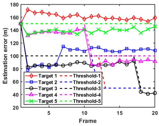 The results of estimation error for each target in case 2 are demonstrated in Figure 12. Firstly, combined with Figure 11, it can be seen that since the discrimination probability of target 1, target 4, and target 5 is always lower than the preset discrimination threshold, the radar system regards these three targets as true targets and tracks them according to the expected tracking accuracy. Therefore, the lower bounds of estimation error in terms of target 1, target 4, and target 5 are less than the expected tracking error and can be dynamically adjusted with the target passing through the task area, reflecting higher target tracking accuracy and adaptive ability. In addition, since the discrimination probability of target 2 is higher than its discrimination threshold, target 2 is judged as a false target, so that its PC-CRLB is always unaffected by the expected tracking accuracy. Finally, the discrimination probability of target 3 is always lower than the threshold in the first 10 frames, so its PC-CRLB meets the expected tracking accuracy requirements. However, after the 11th frame, due to the abandonment of the radar system to optimize the tracking performance of target 3, its PC-CRLB shows a significant increase.