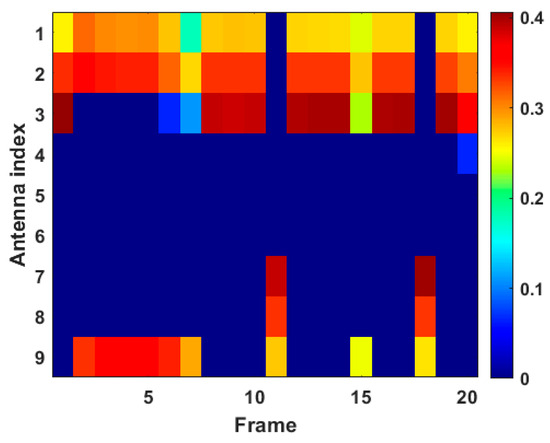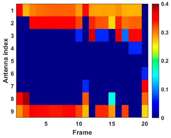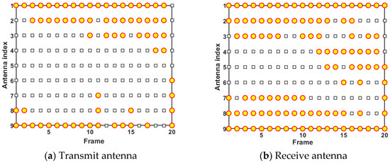 Figure 13 and Figure 14 give the results of antenna scheduling and power allocation in case 2, respectively. According to Figure 13, we can see that the results of antenna scheduling right now are similar to those in case 1, i.e., the radar system tends to assign the antennas closer to moving targets to perform tracking tasks. However, since the intensity of RDJ applied by target 1 is lower than that in case 1, it is difficult for the radar system to accurately identify target 1 as a false target with the finite system resources. In this case, transmit antenna 3 is scheduled more frequently to track target 1, and transmit antenna 9 is less selected for target tracking. It can be seen from Figure 13b that the D-MIMO radar system tends to assign as many receive antennas as possible to measure transmitted signals under the limited number of activable antennas, so as to make full use of the spatial diversity gain to identify false targets.