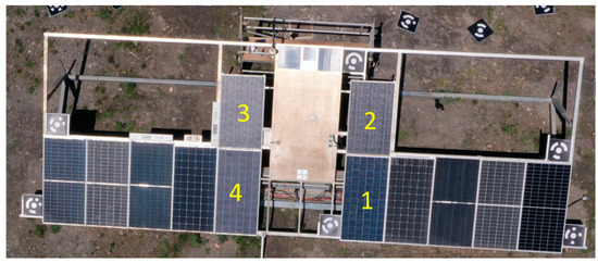 Aerial image of the test bench with 12 modules. Module 1 is clean while the rest were naturally soiled. The central modules numbered 1 to 4 are used for the experiments. The image was taken on the 8 April 2022. At the corners of the setup, one can see the photogrammetry targets that enable the determination of the camera position relative to the modules.
