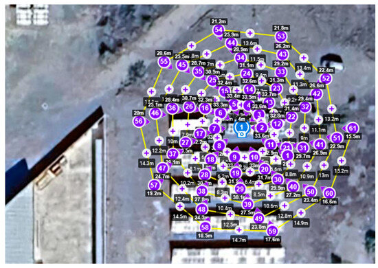 First, the reference measurement is performed. A spiral flight over the clean and the soiled reference module is carried out. Both modules are located directly next to each other so that one flight is sufficient to cover both modules. Afterwards, the measurement flight is performed where the route of the drone is a straight line over the setup in an east–west direction. Figure 3 visualizes the flight route used for the calibration flight. The flight starts in the center, directly above the setup. According to the spiral route, the drone continues to go further to the outside step by step. At the same time, the drone starts at its maximum height and decreases the height the further it goes to the outside of the spiral.