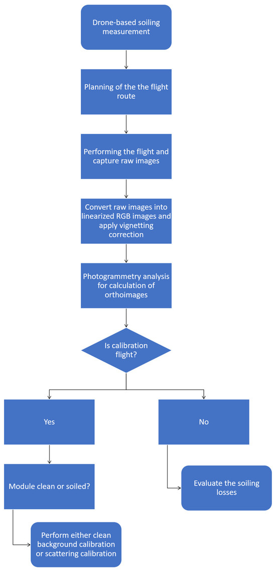Flow chart of the soiling analysis. The sequence starts with the planning of the flight route. Raw images are then captured. Linearized RGB images with vignetting correction are then calculated. These images are then used for the photogrammetry analysis. As a result, the module can be identified on the images and orthoimages are calculated. In case of a calibration flight, these images are then used for the calculation of the two calibration functions. In case of a measurement flight, the soiling losses are calculated.