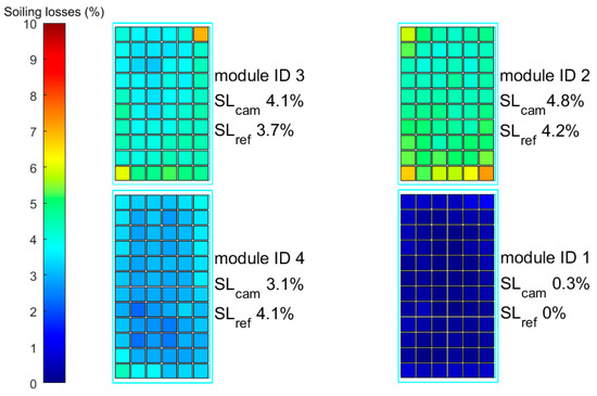All flights performed on the three days are evaluated. As an example, the results of the first flight of the first campaign are shown here in detail, while the other two days are presented in Appendix B. Figure 5 shows the cell-resolved soiling of all four modules that were calculated for the given flight. The lower right module was used as the clean reference module and the upper right module was used as the soiled reference module.