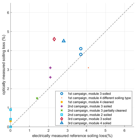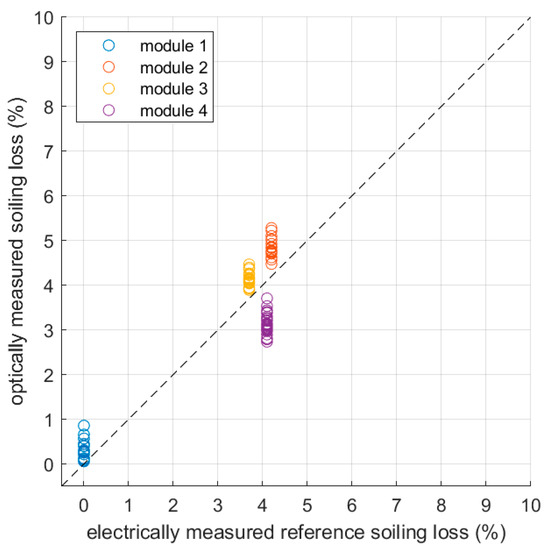 Figure 8 summarizes the results of all measurements performed. It shows the optically measured soiling losses against the electrically measured reference soiling losses. The values are presented on a module level. The RMSE of the measured soiling loss over all measurements is 0.93% absolute. The MAE is 0.70% absolute and the MBE is 0.33% absolute. These three metrics are defined in Equations (1)–(3). With being the total number of data points, identifies each individual data point, is the optically measured value, and is the electrically measured reference value.