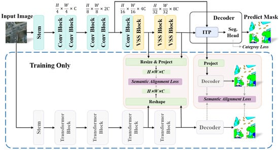 where x represents the input features. is the layer normalization operation. is the linear transform operation. is the depth-wise convolution operation. ⊙ is the element-wise multiplication operation. is the 2D selective scanning operation. represents the result obtained by processing the input feature x through the VSS block. During the training phase, the result obtained after processing through the VSS block is projected with the corresponding stage of the semantic transformer. Semantic alignment loss is later applied during the training phase to help the backbone effectively learn both semantic and spatial detail information.