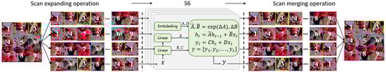 where O stands for the different directions, . x denotes the input features. and represent the scan expanding and scan merging operations, respectively. represents the S6 operation.