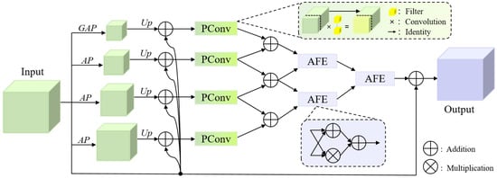 where x represents the input features. represents the initialization processing of the input features. represents the input result after feature aggregation following pooling operations of different scales, where . represents the convolution operation. represents the processing of the input features with different strides and pooling kernel sizes, where corresponds to , respectively. represents the upsampling operation using the bilinear interpolation as the upsampling operator. is the global average pooling operation. Partial convolution (PConv) [30] is a special type of convolutional kernel. Following multiscale pooling and upsampling, the resulting features undergo PConv processing. PConv performs convolution operations on a portion of the channel features while directly mapping the majority. This reduces the computational cost and memory usage for spatial feature extraction within the ITP module. The formula is as follows: