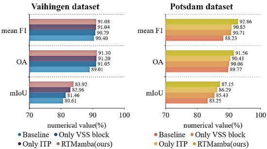 This section analyzes the importance of the model’s components through ablation experiments on the Vaihingen and Potsdam test sets, focusing on the mean F1, OA, and mIoU metrics. The effects of introducing the VSS block and ITP module in a baseline model were evaluated. As shown in Table 1, both the VSS block and ITP module improved all three metrics on both datasets. On the Potsdam test set, the VSS block increased the mIoU by 2.18%, and on the Vaihingen test set, the ITP module increased the mIoU by 2.35%, indicating that both methods effectively improved the overall segmentation performance of objects in remote sensing images. Figure 5 visually demonstrates the improvements resulting from these components. The results show that when both methods were introduced together, RTMamba achieved the best performance, confirming the effectiveness of the VSS block and ITP module.