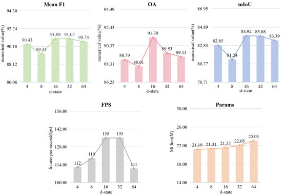 This section examines the impact of the d-state value on the model. The d-state, a crucial parameter in the VSS block, determines the dimensionality of the state parameters and the complexity of the associated probability distribution. Experiments were conducted on the Vaihingen test set with d-state values of 4, 8, 16, 32, and 64, evaluating mean F1, OA, mIoU, FPS, and Params (Table 3). It can be observed that varying the d-state influenced all metrics (Figure 7). In particular, when the d-state value was 16, the mean F1, OA, and mIoU reached their optimal performance at 91.08%, 91.30%, and 83.92%, respectively. Additionally, the FPS was highest when the d-state values were 16 and 32, at 135 FPS. Regarding the parameters, it was observed that the parameters increased as the d-state value increased. When the d-state value was 4, the parameters were 21.19 M, while when the d-state value was 16, the parameters were 21.55 M, representing an increase of only 0.36 M. Overall, the model achieved optimal performance when the d-state value was 16.