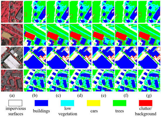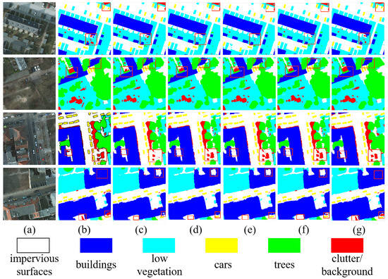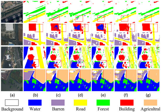(1) Dataset Implementation Details: For the Vaihingen [33] and Potsdam [34] datasets, we cropped the images to . For the Vaihingen dataset, similar to [36], we used 16 images for training and 17 images for testing, which is also the widely used partitioning method for this dataset. The Potsdam dataset consists of 24 training images and 14 testing images. For the LoveDA dataset, cropping was unnecessary as the original image size was already . The models used in the experiments were implemented using the PyTorch framework with a batch size of 4. We used AdamW [37] as the learning rate optimizer, with an initial value of 4 × 10−4 and a weight decay of 1.25 × 10−2. In addition, we used a cosine learning rate schedule to adjust the learning rate. The maximum number of iterations was set to 160,000. During the training phase, basic data augmentation strategies were used, including random horizontal and vertical flipping, as well as random scaling. Other configurations followed the default settings of mmsegmentation [38].