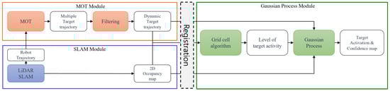 Our proposed method utilizes a LiDAR sensor mounted on a mobile robot. As can be seen in Figure 2, the MOT and SLAM [4] modules operate simultaneously. This framework allows us to generate multiple target trajectories in a global coordinate system. Since these trajectories can include trajectories from not only dynamic objects but also non-dynamic objects, we use a filtering process to remove outliers and generate refined trajectories that only consist of dynamic targets. Subsequently, we divide the entire map into specific-sized grid cells. At each point of the dynamic target trajectory , we calculate the level of target activity, which is defined as the number of targets present within each grid cell. Even for areas where the target does not appear, the activity level is estimated through GRP. This estimated level of target activity is integrated with an OG map to effectively represent the spatial distribution of dynamic targets within the environment as a TA map.