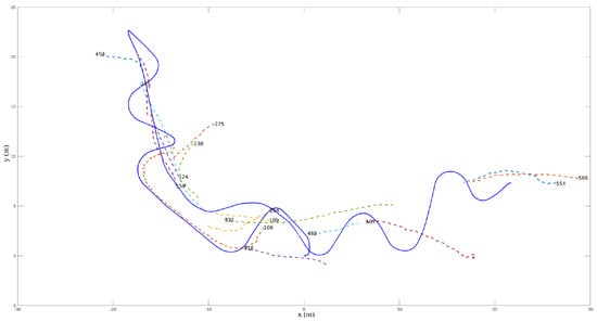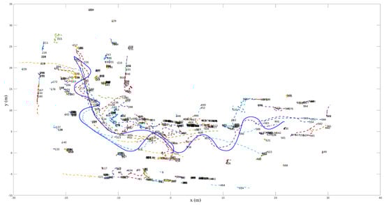 where represents the robot’s pose obtained from LiDAR SLAM. Also, the operator ⊕ denotes the pose composition operator [35]. The transformed trajectory of the targets and the robot’s trajectory are depicted in Figure 3, where the targets are represented with dotted lines and the robot is shown with a solid blue line. The numbers attached to each dotted line represent the ID of the target. As can be seen in Figure 3, the total number of targets is quite large, and unnecessary dummy targets remain.