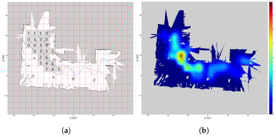 The level of target activity at this position is denoted as , which can be obtained through Algorithm 2. This represents the total number of targets observed within a specific grid cell, which becomes an important indicator for understanding the distribution and density of dynamic objects on the map. The OG map is divided by a predefined grid size k to set up a dimension composed of grid cells (lines 3–6). Based on this, we traverse the entire grid cell and calculate ℓ for each cell (lines 7–13). Then, we find the grid for all positions of the filtered dynamic target and assign ℓ to the position (lines 14–18). The results of Algorithm 2 are visualized in Figure 5a.