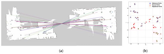 Feature matching and Umeyama method result. The left part of (a) is the reference map, and the right part of (a) is the source map. The points matched in (a) are transformed to the metric scale and are represented as blue circle points and red triangle points, respectively, in (b). The source points transformed by the results of the Umeyama method, and , are depicted as yellow star points, indicating a proper transformation.