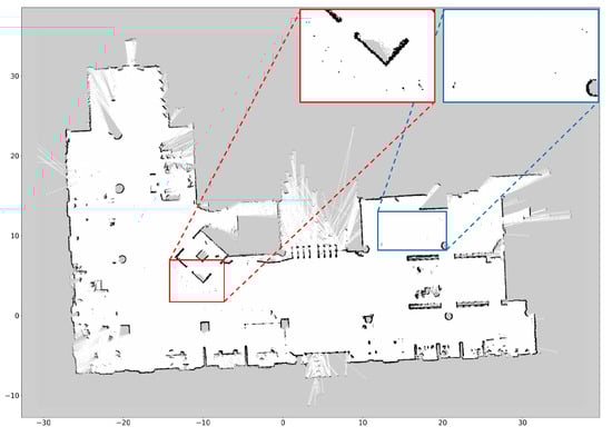 We conducted experiments on path planning according to each map in the library environment. The TA map of Section 5.3 was used, and two types of OG maps were utilized for comparison. One was the OG map [4] in Figure 10c, which was used to create the TA map. This map does not include the footprint, which refers to the occupied area due to the influence of dynamic objects during the map-building process rather than the trajectory of the MOT. The other OG map [41], as depicted in Figure 11, has the footprints of dynamic objects in some areas. Maps with residual footprints, such as OG map [41], can be retrieved from suboptimal mapping algorithms or significant influences from dynamic objects. Although we can obtain maps like OG map [4] in our environment, maps such as OG map [41] are commonly found in various real-world environments and conditions and have been included in experiments to better understand and compare path planning outcomes. Path planning in the OG maps was implemented using the conventional A* algorithm.