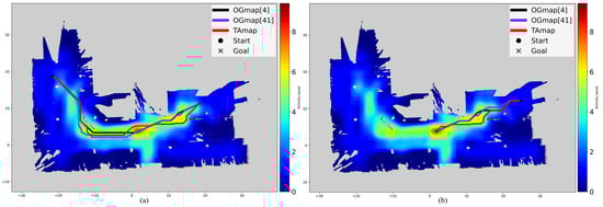 In case 1, as seen in Figure 12a, the TA-map-based path (red) successfully avoids all high-activity areas. In contrast, the OG-map-based path (black) [4] passes through the area with the highest activity level, despite it being the shortest path. The OG-map-based path (purple) [41] is unnecessarily lengthened due to dynamic object footprints, and it also traverses the highest activity area. In case 2, as shown in Figure 12b, the TA-map-based path successfully navigates toward the area with the highest activity while avoiding other high-activity zones. This capability arises because the Euclidean distance has a greater impact than the activity level when it approaches the destination. Conversely, using the OG maps leads to crossing high-activity areas. The OG-map-based path [41] also experiences an increase in length due to dynamic object footprints.