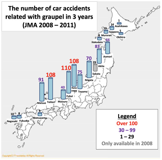 - Yatsuo, T.; Hattori, H.; Okura, T.; Aiba, Y. Operation and effectiveness of an information-providing system using graupel detection. In Proceedings of the Yukimirai Conference, Akita, Japan, 7–8 February 2013. (In Japanese). [Google Scholar]