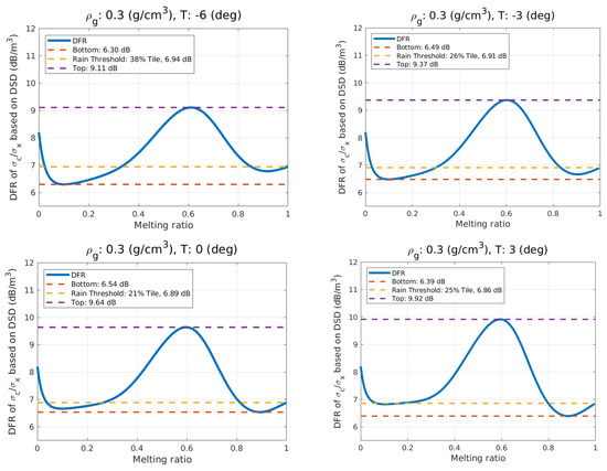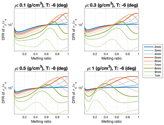 As indicated previously, the DFR is a function of melting ratio, density, and temperature. In this study, the temperature range is varied between −6 °C and 3 °C, corresponding to graupel conditions. This range aligns with the seasonal-minimum monthly mean temperature recorded at Wajima observatory in Japan during the period of 1991–2020, which was −4.2 °C at a geopotential height of 1 km and 3 °C at ground level [31]. Assuming a density equal to unity implies that all particles are melted, thus resulting in a melting ratio of unity. However, the DFR calculations can yield melting ratios other than unity.
