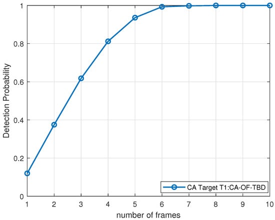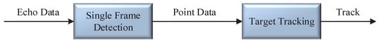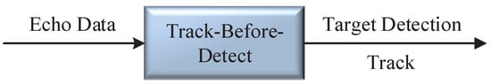 Target detection and tracking is the most critical task of a radar system, especially the detection and tracking of weak maneuvering targets (which represents a significant problem to be solved). The traditional radar processing system firstly performs signal processing for the echo data, and it then performs data processing to achieve target detection [1], as well as tracking [2,3], as shown in Figure 1. However, since detect-before-track (DBT) performs target detection by setting a threshold, such as a constant false alarming ratio (CFAR), the threshold setting becomes a limitation of the target detection performance, and, in the case of a low signal-to-noise ratio (SNR) or the overlapping of strong and weak targets, the threshold detection will also have the problem of weak target leakage. Therefore, to solve the problem of weak target detection and tracking, track-before-detect (TBD) [4,5,6] uses a non-threshold or low-threshold method to process the raw radar echo data, thus improving the detection probability of weak targets. TBD fuses the detection and tracking processes with a unified framework [4,7,8] to process the echo data and utilize multi-frame joint processing [9,10,11] to make full use of the information in the raw echo data to achieve more efficient detection and tracking, as shown in Figure 2.
