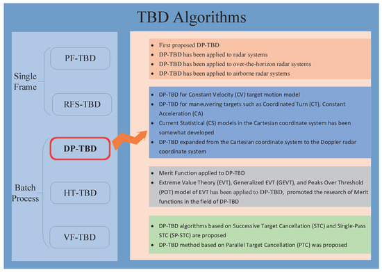 As shown in Figure 3, the existing research on the DP-TBD algorithm mainly focuses on the following aspects. DP-TBD improves the detection probability of weak targets by converting a multi-stage problem in the same batch processing into multiple single-stage problems searching for a local optimum while accumulating the target energy along feasible paths after single-stage processing. DP-TBD was first used for weak target detection and tracking in optical images [24], and then DP-TBD was successively applied to radar systems [16], over-the-horizon radar systems [25], and airborne radar systems [26].
