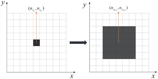The iterative energy accumulation process described in the above two subsections targets the state information of the target’s next frame that can be predicted by accurate equation derivations in DP-TBD, which can reduce the range of the target state transfer in the traditional DP-TBD algorithm. The target state transfer range is typically symbolized by the state transfer number q. The values of q often encompass 9, 16, 25, etc., with the specific choice of a larger or smaller state transfer number q adjusted to the actual scenario. For instance, given and 25, the state of the CA target at frame k could potentially be , as expressed in Equation (47) detailed below: