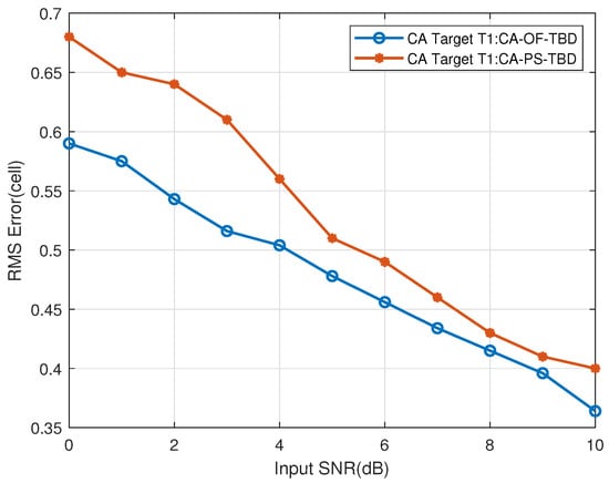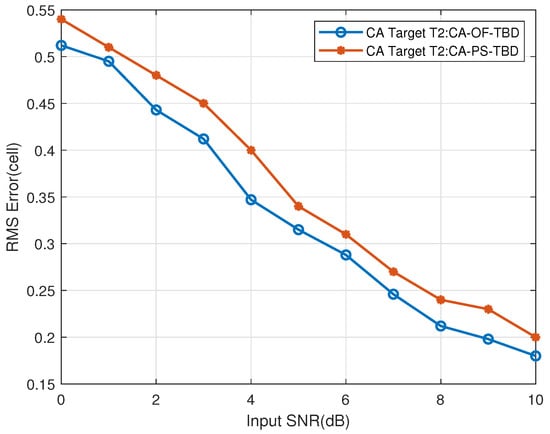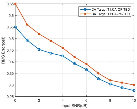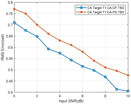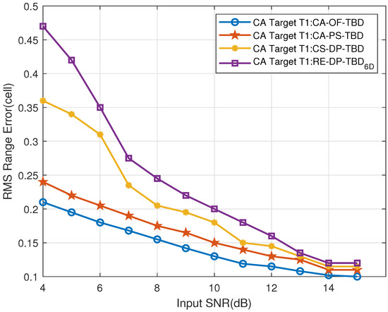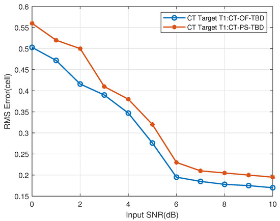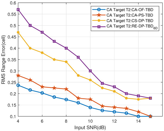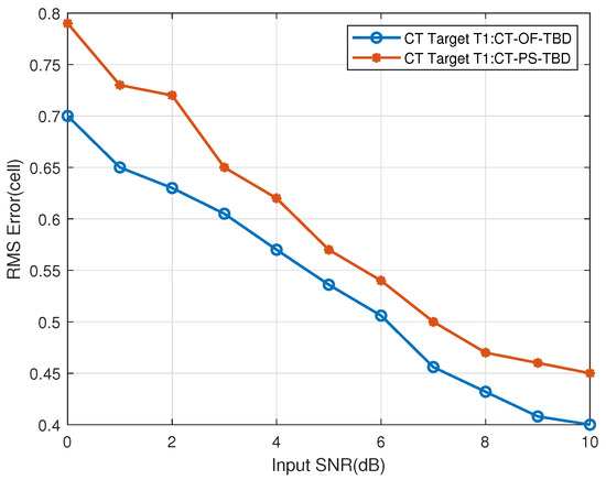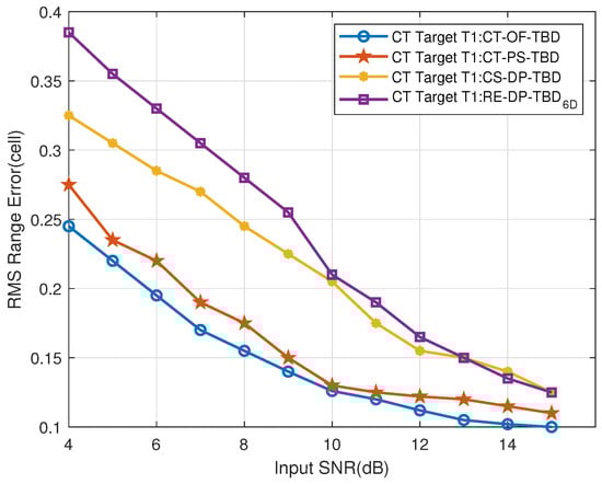 Figure 31. The CT far-region Target T1’s range RMSE vs. input SNR.