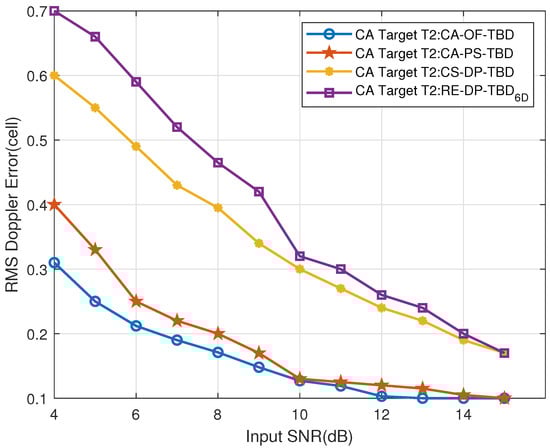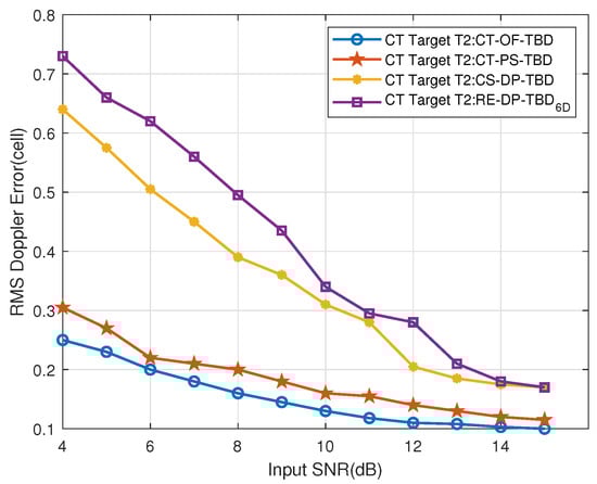 Figure 34. The CT near-region Target T2’s Doppler RMSE vs. input SNR.