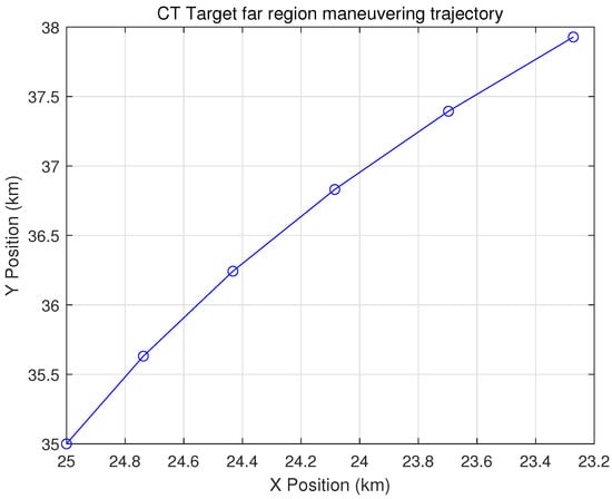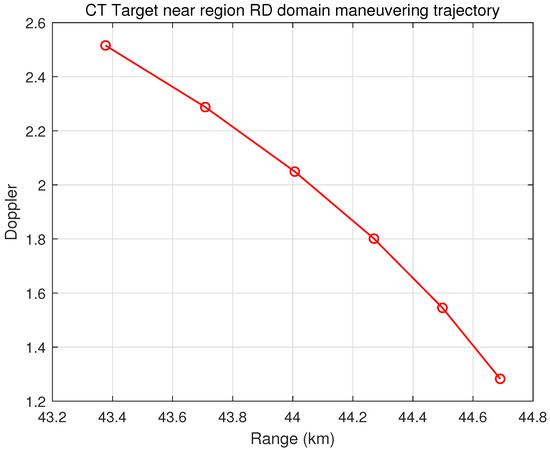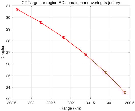 The evolution of RD, as depicted in Equations (27) and (28), is determined by the turning rate and the product . The latter is the multiplication of the fixed, initial value of the range and Doppler states in the CT model and its first-order derivatives . Since all three parameters in the CT model are time-invariant within the unified processing batch, their updates during the iterative process can help lessen the extent of computation and enhance efficiency.