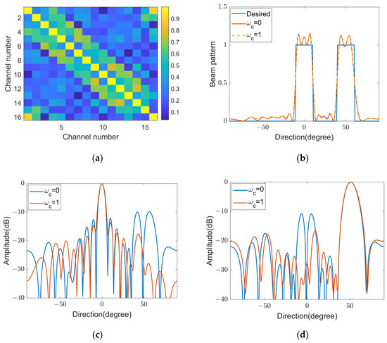 The covariance matrix results through the beam-pattern matching method. (a) The modulus value graph of the designed covariance matrix when . (b) The beam-pattern results of the designed covariance matrix. (c) Correlation characteristics between the beam in the direction and the beams in other directions. (d) Correlation characteristics between the beam in the direction and the beams in other directions.