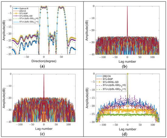 Spatial–temporal joint optimization results for partial-related waveform. (a) The comparison of beam-pattern characteristics from different methods. (b) The autocorrelation of the spatial synthesis signal of the waveform designed using the STJ-L2pSL-GD method, where in the directions of interest. (c) The autocorrelation of spatial synthesis signals of the waveform designed using the STJ-SQP method, where in the directions of interest. (d) The projection of autocorrelation of the spatial synthetic signals in the directions of interest, and , to the distance dimension.