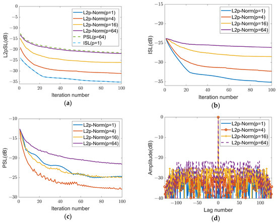This section analyzes the influence of on the ACSLs of spatial synthesis signals in the directions of interest under the L2p-Norm criterion. The results are shown in Figure 6. Figure 6a shows the convergence curve of L2p-Norm sidelobes (L2pSL) of spatial synthesis signals with different values under the STJ-L2pSL-GD method. It indicates that the convergence curve of L2pSL completely overlaps with the ISL curve when is equal to 1, and as increases, the convergence curve of L2pSL quickly approaches the PSL curve, which confirms the analysis in Section 2. So, by setting to different values, various criterion effects, including the ISL criterion, approximate PSL criterion, and their compromise, can be achieved. Figure 6b shows the ISL convergence curves of our STJ-L2pSL-GD method under different values. It indicates that the smaller the , the faster the convergence speed of the ISL. This is because the smaller the , the more inclined the L2p-Norm criterion is towards the ISL criterion. Figure 6c,d show the convergence curves of the PSL and the autocorrelation response of the spatial synthesis signal for 100 iterations under different values, respectively. It can be seen that since the PSL is not the objective function, its monotonic convergence cannot be guaranteed. Additionally, the convergence speed of the PSL increases first and then decreases as increases. When is about 4, the fastest PSL convergence speed and the lowest PSL are achieved. This indicates that taking an appropriate value of will result in a faster PSL convergence speed and a better PSL suppression effect than adopting the PSL criterion.