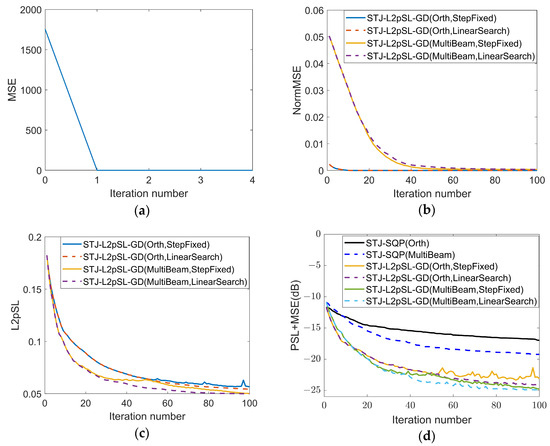 To evaluate the convergence and efficiency of our algorithm, this experiment is conducted by using a regular laptop computer with a CPU configuration of Intel Core i7-11800H, a main frequency of 2.3 GHz, and a memory configuration of 40 GB. Figure 7a is the convergence curve of the MSE for beam-pattern matching in covariance designing. It indicates that the convergence is achieved with only one iteration, the converging MSE value is only 0.103, and the time taken is only 5.20 s. Figure 7b,c show the convergence curves of the MSE for covariance matching and the convergence curve of L2pSL of spatial synthesis signals in the directions of interest for our STJ-L2pSL-GD method, respectively. It indicates that both they gradually decrease with the number of iterations. Additionally, when the step size of gradient descent is determined through the one-dimensional linear search method, the L2pSL value of the spatial synthesis signals monotonically decreases with the number of iterations, indicating good convergence of the algorithm. Figure 7d shows the convergence curves for the sum of PSLs in the temporal domain and MSEs from the covariance matrix matching of the STJ-SQP algorithm or STJ-L2pSL-GD method under different modes and parameters. It indicates that the objective function values of both methods decrease with the number of iterations, reaching about −15 dB and −25 dB after 100 iterations, respectively. Obviously, under the same number of iterations, the effects of our STJ-L2pSL-GD method are far superior to the STJ-SQP method. Moreover, as the essence of the SQP method is transforming nonlinear problems into a series of quadratic programming problems using Taylor expansion, it requires calculating the Hessian matrix and gradient of its objective function at each iteration, while our STJ-L2pSL-GD method only needs to calculate the gradient of the objective function. Therefore, the time required for each iteration using our STJ-L2pSL-GD method is significantly reduced compared to the STJ-SQP method. Specifically, the STJ-SQP algorithm takes 4319.44 s to iterate 100 times, while our STJ-L2pSL-GD method takes 69.08 s and 235.03 s to iterate 100 times under a fixed step size and linear search for step size, respectively.