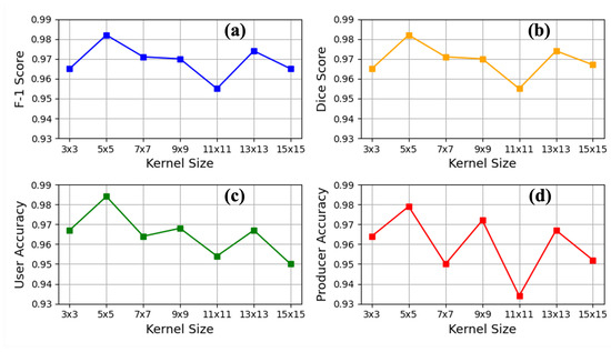 Performance metrics (a) F-1 score, (b) dice score, (c) user accuracy, and (d) producer accuracy plotted against different kernel sizes (3 × 3, 5 × 5, 7 × 7, 9 × 9, 11 × 11, 13 × 13, 15 × 15) for the ADU-Net model.