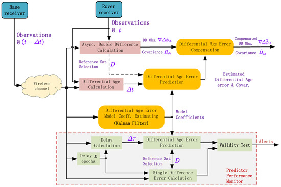 The overall system block diagram is presented in Figure 2. As illustrated in the figure, the data processing involved in this study is divided into three parts: (1) the conventional asynchronous DD observation calculation (shown in the pink boxes); (2) the differential age error estimation, prediction, and compensation proposed in this paper (shown in the yellow boxes); and (3) the proposed predictor performance monitor for the integrity assessment (shown in the green boxes). We provide a detailed description of each part in the following sections.