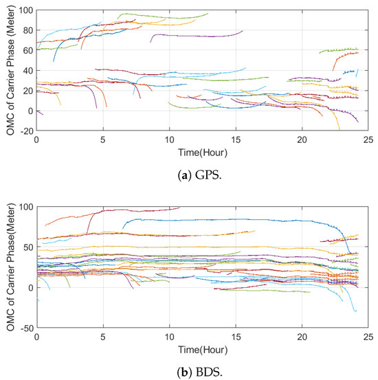 Figure 3 gives the undifferentiated carrier phase observation minus calculation (OMC) during the experiment, i.e., the expression in (9). Each line in the figure presents one satellite observation. Notice that because the receiver’s position was known accurately as a prior, the curve ripples in Figure 3 were mainly caused by satellite orbit/clock and atmospheric compensation errors. Variations in the receiver’s clock error also contributed to the curve ripples; however, this can be eliminated by the differential operation between satellites.