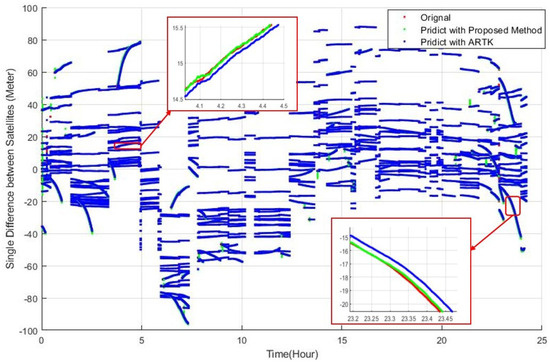 Figure 4 shows the time domain comparison between the actual observations received, the predicted values of the method proposed in this work, and the ARTk method’s predicted values. Due to space limitations, only the case featuring the 120 s differential age and BDS satellite observation is shown here. To eliminate the local receiver’s clock error fluctuation, the curves shown in the figure are single-difference carrier phase observations with the reference satellite. Each curve represents a single-difference carrier observation. It is shown that the changes in SD observations over time were generally smooth, and some observations exhibited significant changes over time. The ARTK method only shifts historical observations, so it generates large errors when the observations change significantly over time. The method proposed in this article can better track the changes over time and can achieve a substantial improvement in prediction performance. It is worth noting that because the prediction method used in this work is independent of reference satellite selection, it can be easily managed when the reference satellites change.