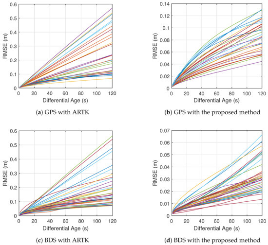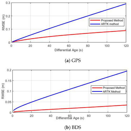 In Figure 6, it is clear that the proposed method exhibited a significant improvement in prediction performance as compared to the ARTK method. At a differential age of 60 s, the overall RMSE of the GPS reduced from 16 cm to 5.7 cm, and the overall RMSE of the BDS reduced from 11 cm to 2 cm. At a differential age of 120 s, the overall RMSE decreased from 28.9 cm to 8.7 cm for the GPS and from 19 cm to 3.5 cm for the BDS. Therefore, it can be expected that, for the RTK algorithm, the proposed method will generate a significant increase in the fixed rate for large differential age scenarios.