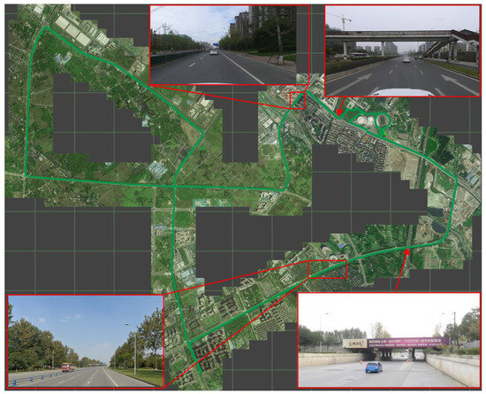 The vehicle platform utilized in the test was the model EX5 SUV from Weltmeister Motor Co., Ltd., (Shanghai, China) and the rover station’s GNSS antenna was installed on the vehicle’s roof. The rover GNSS receiver was an LG69T from Quectel Co., Ltd. (Shanghai, China). Its supported frequency band includes L1 C/A and L5 for GPS/QZSS, E1 and E5a for Galileo, and B1I and B2a for BDS. Its observed data output frequency was set to 5 Hz. The Novatel’s SPAN-ISA-100C integrated navigation system was adopted as the reference ground truth system. This includes two GNSS receivers, PwrPak7D, and a high-precision inertial measurement unit (IMU): IMU-ISA-100C. One PwrPak7D receiver was used as the base station receiver, and the base station antenna was installed on the building’s roof at a known coordinate. Another PwrPak7D receiver and IMU-ISA-100C were installed in the trunk of the car as rover stations. The radio frequency signal from the GNSS antenna on the EX5 vehicle’s roof was split two ways, i.e., the LG69T and PwrPak7D receivers. The LG69T observation data were saved in the portable computer through a USB port, and the SPAN-ISA-100C observation data were saved in PwrPak7D. The observation data saved by PwrPak7D were post-processed using the post-processing software from Novatel (Calgary, Canada), i.e., Inertial Explorer (Version 8.90).
