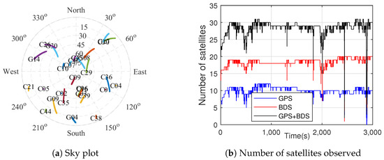 As shown in Figure 8, the field kinematic experiment scene included various scenarios, e.g., boulevards, urban canyons, overpasses, and open-sky. Figure 9 shows the sky plot and the number of satellites observed during the experiment. The figure shows that more than 20 GPS/BDS satellites were observed during most of the experiment.