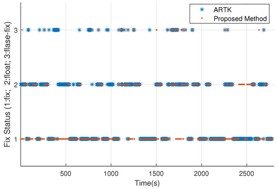 In the simulation, various differential ages of 40 s, 60 s, 80 s, 100 s, and 120 s were introduced, and RTK solutions were calculated using the ARTK and the proposed method. For example, Figure 10 presents the fixed states over time using the two algorithms with a differential age of 120 s. The fixed rates and false fixed rates of the integer ambiguity for the two methods were statistically calculated for each differential age. Here, the false fixed solution denotes an incorrect fixed solution. The specific method of determination was to compare the RTK positioning results with the reference value. When the RTK calculated result was a fixed solution and the absolute positioning error was greater than 0.1 m, the fixed solution of the epoch was considered to be a false fixed solution.