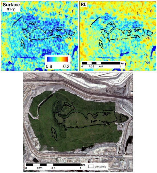 The objective of our study was not to extract absolute soil moisture. Instead, it aimed to explore the effectiveness of using time series of SAR imagery to identify trends in relative soil moisture, as indicated by the soil moisture index. A persistent challenge in our and other studies on soil moisture estimation is the comparison of in situ measurements (using a contact-based sensor) with spatially distributed SAR SSM products, particularly given the 30 m resolution of the SAR data. Such a spatial resolution can complicate direct comparisons due to the heterogeneous nature of soil moisture distribution over larger areas. Consequently, it was an important finding that the SAR-derived products complemented the field-identified wetland areas to facilitate a better validation of soil moisture estimates. The correspondence between higher values of SSM, derived from the surface component of m-χ decomposition and RL products, and field-verified wetland locations meant that we could successfully identify water-saturated areas. The usage of these products highlights the effectiveness of RCM CP data in environmental monitoring involving soil moisture. This SAR-based technique is especially suitable for non-vegetated or sparsely vegetated flat areas which are typical for newly reclaimed oil sands mining landscapes. Compared to traditional field-based methods, the presented approach is more efficient and cost-effective.