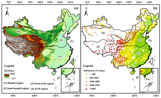 Figure 1. (a) Digital elevation model (DEM) and (b) locations of meteorological stations in mainland China.