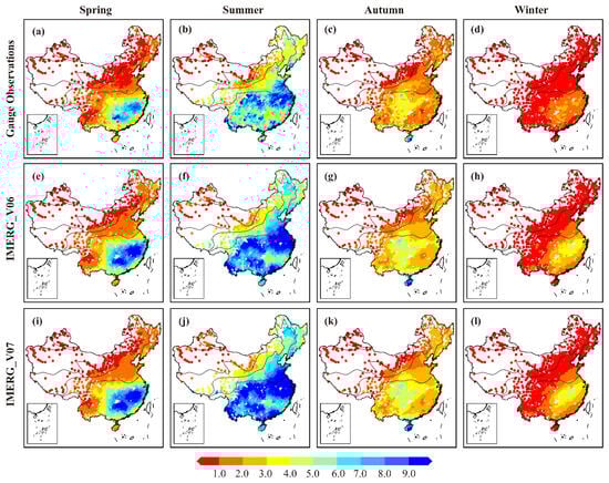 Figure 2. Spatial distribution of precipitation for meteorological stations (ad), IMERG_V06 (eh), and IMERG_V07 (il) over four seasons (spring, summer, autumn, and winter).