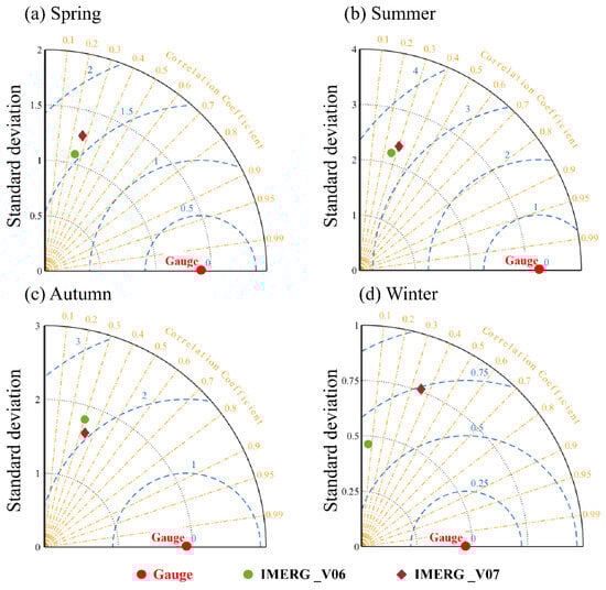 To visually understand the precipitation retrieval accuracy and errors of the two versions of IMERG SPEs in different seasons, a Taylor diagram (Figure 4) is used to display the overall performance at an hourly scale based on three indicators, including correlation coefficient, standardized standard deviation, and root mean square error. As shown in Figure 4, IMERG_V07 consistently exhibits higher CC values than IMERG_V06 in all seasons, especially in winter. The CC value of IMERG_V06 is only around 0.1 in winter, while the CC value of IMERG_V07 is approximately 0.3–0.4. This is consistent with the spatial distribution of IMERG_V07 in Figure 4, which shows higher correlation coefficients. It indicates that IMERG_V07 has significantly improved data consistency. Although IMERG_V07 has slightly lower RMSE values than IMERG_V06 in summer and autumn, its performance is inferior to IMERG_V06 in winter and spring. IMERG_V06 has a smaller standard deviation (STD) than IMERG_V07 in spring and winter, while both precipitation products perform similarly in summer. In autumn, IMERG_V07 shows better performance. Overall, IMERG_V06 and IMERG_V07 exhibit their respective advantages in different seasons. IMERG_V07 has shown significant improvement in data consistency compared to IMERG_V06. It performs better than IMERG_V06 in summer and autumn but falls short in winter and spring.