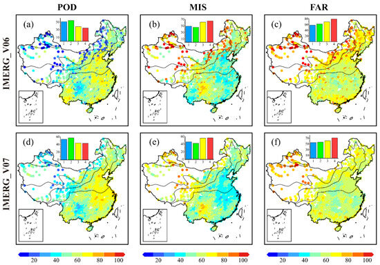Figure 5. Hourly-scale spatial distribution of categorical statistical indexes (POD, MIS, FAR) for IMERG_V06 (ac) and IMERG_V07 (df) with a 0.1 mm/hour precipitation/no precipitation threshold. The barplot with different colors indicates the regional averaged values for POD, MIS, and FAR with a unit of %. The x-axis numbers 1–4 correspond to humid, semi-humid, semi-arid, and arid regions, respectively.