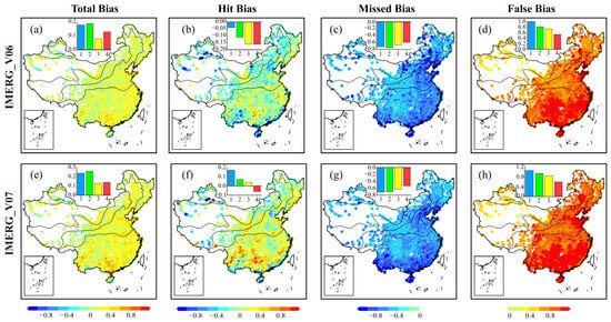 Firstly, from Figure 6a–e, it can be observed that the values of Total bias are relatively small (ranging from 0 to 0.3 mm) and significantly smaller than the sum of the three error components. This indicates the presence of offsetting positive and negative errors among the error components. Therefore, relying solely on the conventional total precipitation bias to evaluate the performance of SPEs is not sufficiently accurate, and the analysis of precipitation amount errors should consider the characteristics of precipitation events [30,31]. Both IMERG_V06 and IMERG_V07 exhibit an overestimation of precipitation in mainland China, particularly in the humid regions.