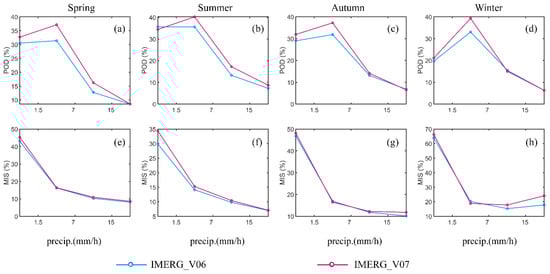 Figure 7. Hourly precipitation classification metrics for IMERG SPEs at different intensities in spring (a,e), summer (b,f), autumn (c,g) and winter (d,h) in mainland China. Note that different Y-axis limits are used in Figure 7.