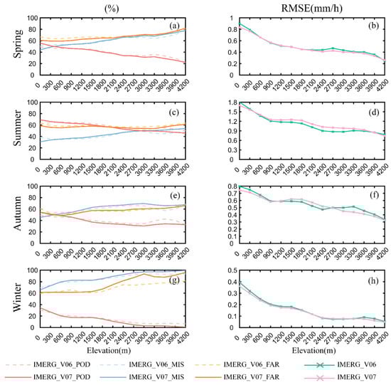 Figure 8. Categorical statistical indices (ad) and RMSE (ch) as a function of elevation for IMERG SPEs in spring, summer, autumn, and winter.