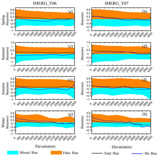 Based on the observed elevation-dependent characteristics of the error components discussed earlier, we further evaluated the terrain dependency of IMERG_V06 and IMERG_V07 SPEs. In this section, we computed the corresponding error components (Total bias, Missed bias, Hit bias, and False bias) based on seasonal average precipitation and analyzed the dependency of IMERG SPEs’ error components on different elevations (Figure 9).