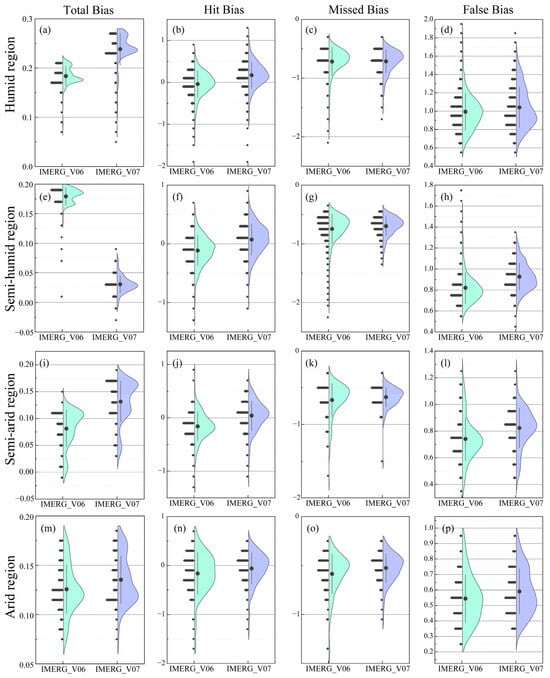 By observing Figure 10a,e,i,m, it can be found that in the semi-humid region, IMERG_V07 shows significant improvement in Total bias compared to IMERG_V06, decreasing from 0.175–0.19 mm to 0.025 mm. IMERG_V06 and IMERG_V07 perform almost the same in terms of Total bias in the arid region. However, in the humid and semi-arid regions, IMERG_V06 performs better than IMERG_V07, and IMERG_V07 exhibits higher data dispersion in the arid region. In all four climate regions, both IMERG_V06 and IMERG_V07 have a Total bias greater than 0, indicating an overestimation of precipitation, especially in the humid region, which is consistent with the analysis results in the previous figure (Figure 6).