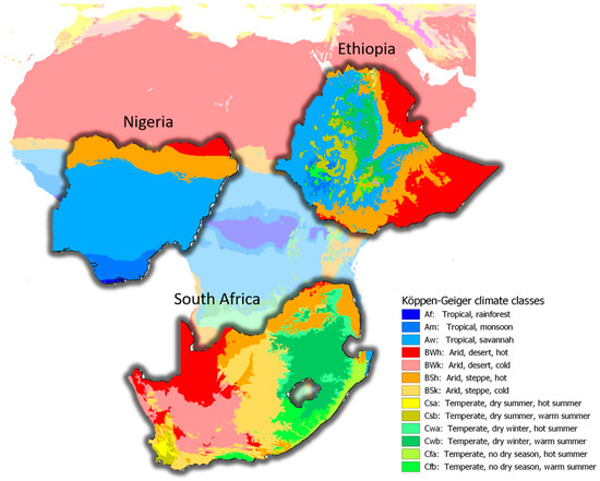 Ethiopia, Nigeria, and South Africa are located in three different geographical regions of Africa, each with novel climates that may impact ecological gradients and, therefore, LULC mapping efforts. Per the Köppen–Geiger climate model [26], Ethiopia contains arid desert and steppe in the eastern lowlands and a mix of tropical savanna in the west with some temperate climates at higher elevations in the center of the country. Nigeria is in the African west, and mostly falls in the tropical (savannah) climate zone, with a tropical (monsoon) climate in the south and an arid climate in the north. South Africa covers different subcategories of arid climate in the north and west, and temperate climates in the east (Figure 1).